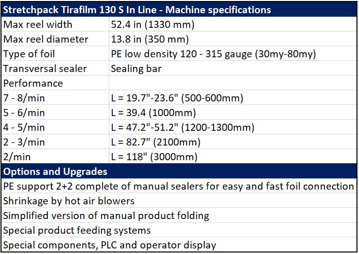 The Sotemapack Stretchpack 130 S IL is an automatic horizontal shrink bundler with a programmable high speed in line product in-feed pusher system. The machine wraps around four sides of panels, insulation boards, trays, boxes and similar products with stretched PE foil to provide a stable package without shrink. Available in manual or automatic product feeding.