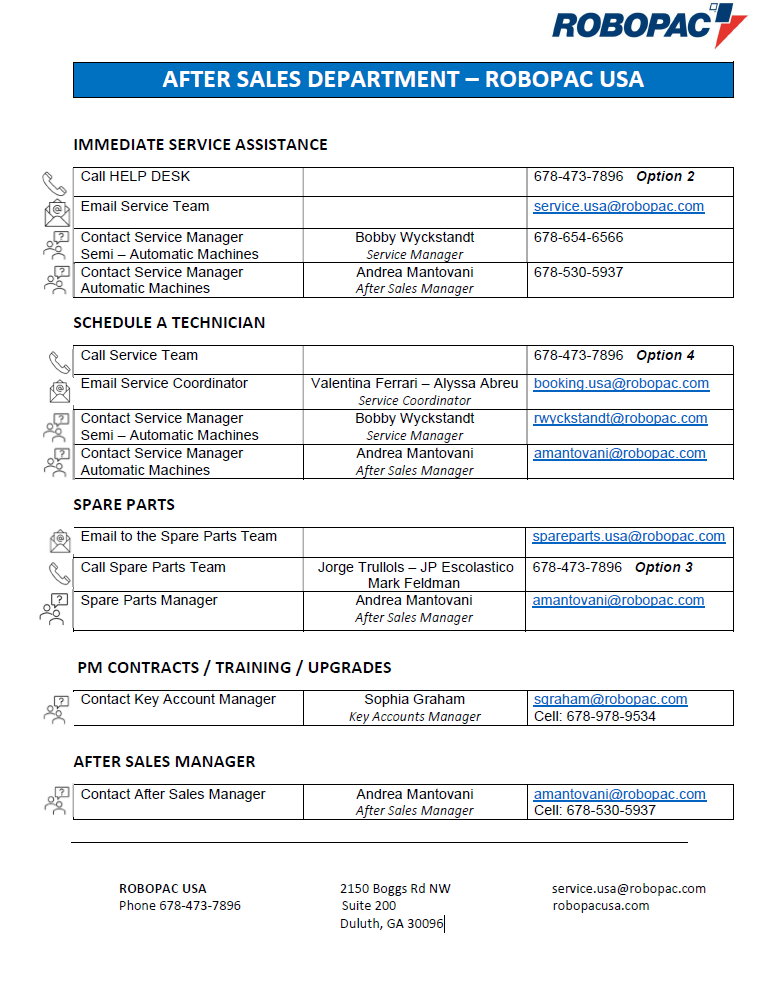 Robopac USA has over 250 machines in stock at our Atlanta Georgia facility for quick delivery. Most semi-automatic stretch wrappers ship within 48 hours. Robopac USA has over $2M in spare parts with over 90% shipping the same day!