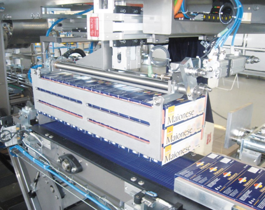 Particularly suited for products with an irregular shape and low stability, this device guarantees correct and precise coupling of the product with the blank. The unit controlled by a brushless motor and can also be used to transfer the product from the machine to the shrink tunnel.
